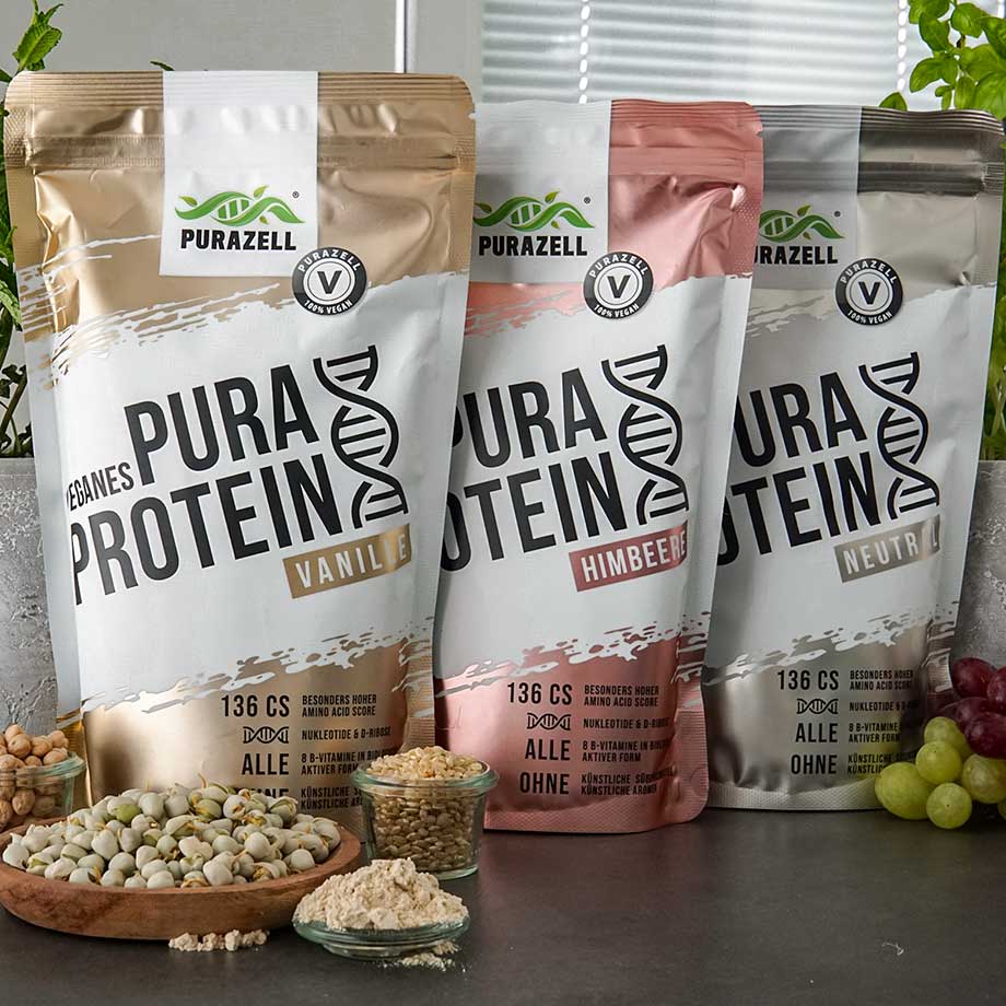 Ein wirklich perfektes Proteinpulver braucht ein paar Extras, um Dich beim Erreichen Deiner Ziele besonders gut unterstützen zu können. Deshalb hält Pura Protein 3 Überraschungen für Dich bereit: 136 CS (Biologische Wertigkeit des Proteins - zum Vergleich: Whey Protein liegt meist bei 90 CS), Nukleotide und alle 8 B-Vitamine in organischer Form! Gesunde Vitamin-Level sind essentiell für ein normales Wachstum und die Entwicklung aller Körperorgane und-gewebe. Und auch Muskeln bestehen aus Muskelgewebe. Gutes Training ist wichtig, klar, doch nur die wenigsten beachten dabei folgendes: Biotin unterstützt die Energiegewinnung aus Fett und wird benötigt, um die Energiegewinnung aus Kohlenhydraten zu steuern - und ist sogar am Zellwachstum beteiligt. Auch Vitamin B9 ist am Zellwachstum und an der Blutbildung beteiligt. Zusammen mit B12 unterstützt es den Erhalt der Knochendichte und die Leistungsfähigkeit des Gehirns. Vitamin B12 ist außerdem an der DNA-Synthese und damit an allen Wachstumsvorgängen im Körper beteiligt. Pyridoxin (Vitamin B6) ist wichtig für die Muskelaktivität, denn es wird für die Gewinnung von Energie aus den Kohlenhydratspeichern in den Muskeln benötigt. Niacin (Vitamin B3) ist nicht nur wichtig für den Stoffwechsel, es unterstützt auch den Blutfluss der Gefäße. Riboflavin (Vitamin B2) unterstützt die Verwertung von Nährstoffen. Zudem dient es als Oxidationsschutz - und beim Training, aber auch im aktiven Alltag, benötigen wir diesen ganz besonders. Thiamin (Vitamin B1) spielt eine ganz besondere Rolle für die stoffwechselaktive Ernährung und die Optimierung der Zellfunktion. Ein Mangel an Thiamin ist mit der Erkrankung “Beri Beri” assoziiert, was so viel wie “Schwach Schwach” bedeutet. Einer von vielen Gründen, warum wir unsere Thiamin-Level immer gesund halten wollen, “Stark Stark” finden wir nämlich deutlich besser. … deshalb ist unser hochwertiges, rein pflanzliches Pura Protein nicht nur mit Nukleotiden, sondern auch mit einer guten Portion B-Vitaminen ausgestattet. Alles, was Du tun musst, ist, Dich zu entscheiden: Neutral, Vanille oder doch lieber Himbeere?