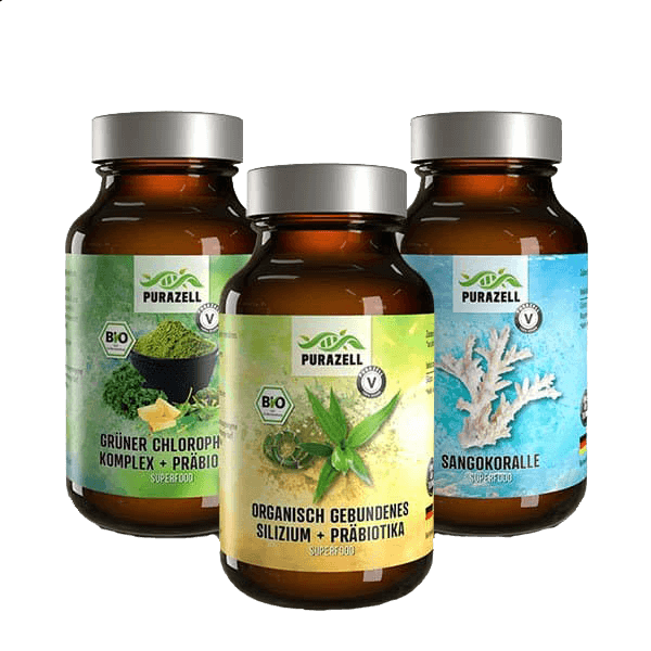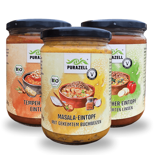 Was steckt in Pura One und wie wirkt es? Pura One enthält die wichtigsten Vitamine, Mineralstoffe und Mikronährstoffe. Besonderen Fokus haben wir bei der Zusammenstellung auf die Nährstoffe gelegt, die in unserer modernen Ernährung oft zu kurz kommen. So ist ein Nahrungsergänzungsmittel entstanden, das dich gleich auf mehrere Arten unterstützen kann: Für dein Immunsystem Vitamin C, B6, B9, B12, Selen: Tragen zu einer normalen Funktion des Immunsystems bei Vitamin C: Trägt zu einer normalen Funktion des Immunsystems während und nach intensiver körperlicher Betätigung bei. Energie und Leistungsfähigkeit Vitamin C, B6, B12, Calcium, Magnesium: Tragen zu einem normalen Energiestoffwechsel bei Vitamin C, B6, B9, B12, Magnesium: Tragen zur Verringerung von Müdigkeit und Ermüdung bei Calcium, Magnesium: Tragen zu einer normalen Muskelfunktion bei Proteine: Tragen zum Aufbau und Erhalt der Muskelmasse bei Psyche und Konzentration Vitamin C, B6, B9, B12: Tragen zur normalen psychischen Funktion bei Vitamin C, B6, B12, Magnesium: Tragen zu einer normalen Funktion des Nervensystems bei Haut, Haare, Knochen und Nägel Vitamin C: Trägt zur normalen Kollagenbildung für eine normale Funktion von Haut, Zähnen und Knorpeln bei. Calcium: Wird für die Erhaltung normalen Knochen und normaler Zähne benötigt Selen: Trägt zur Erhaltung normaler Nägel und Haare bei. Magnesium: Trägt zur Erhaltung normalen Knochen und Zähne bei Für deine Verdauung Vitamin B6, B9, B12, Betain: Tragen zu einem normalen Homocysteinstoffwechsel bei Vitamin B6, Magnesium: Tragen zu einem normalen Eiweißstoffwechsel bei Vitamin B6: Trägt zu einem normalen Glycogenstoffwechsel bei Vitamin B9: Trägt zu einer normalen Aminosäuresynthese bei Calcium: Trägt zur normalen Funktion von Verdauungsenzymen bei Allgemeines Wohlbefinden Vitamin C, Selen: Tragen dazu bei, die Zellen vor oxidativem Stress zu schützen Hochwertige Pflanzextrakte und Antioxidantien verstärken die positive Wirkung auf Gesundheit und Wohlbefinden noch weiter: Erbsenprotein-Hydrolysat: Liefert hochwertiges pflanzliches Protein. Taurin: Aminosäure, die in vielen Körpergeweben vorkommt und an zahlreichen Prozessen beteiligt ist. Sangokoralle: Hervorragende Quelle für Calcium und Magnesium Weizengras- und Hafergras-Saftpulver: Enthalten viele sekundäre Pflanzenstoffe, wie Chlorophyll und Antioxidantien. Chlorella & Spirulina: Mikroalgen, die als hervorragende Quelle für Proteine, Vitamine und Antioxidantien dienen Moringa-Pulver: Nährstoffreiches Pulver des Meerrettichbaums. Reich an Antioxidanzien, verschiedenen Vitaminen und Carotinoiden, Mineralstoffen, Saponinen und Polyphenolen. Brokkoli-Extrakt: Liefert sekundäre Pflanzenstoffe wie Sulforaphan, die antioxidative Eigenschaften haben. Petersilien-Extrakt: Enthält eine hohe Menge an Vitamin C und sekundären Pflanzenstoffen. Aronia-Extrakt & Schwarze Johannisbeere-Extrakt: Sind reich an Anthocyanen und Antioxidantien. Acerola-Extrakt: Die Acerola-Kirsche ist eine der besten bekannten Quellen für Vitamin C. Grüntee-Extrakt: Enthält antioxidativ wirkende Polyphenole und EGCG. Japanischer Honigbaum-Extrakt: Reich am Flavonoid Quercetin. Traubenkern-Extrakt: Liefert oligomere Proanthocyanidine (OPC) mit antioxidativen Eigenschaften. Mariendistel-Extrakt (Silymarin)& Weißdornextrakt – Werden traditionell zur Unterstützung der Gesundheit eingesetzt. Kolanuss-Extrakt: Ist bekannt für seinen hohen Gehalt an Koffein und Theobromin Enzymmischung Digestiv V: Enthält Verdauungsenzyme, die die Nährstoffaufnahme unterstützen können. Nukleotide: Wichtige Bausteine der DNA in unserem Organismus Coenzym Q-10 (Ubiquinol): Übernimmt in unserem Körper eine wichtige Aufgabe im Energiestoffwechsel der Zellen. Lycopin aus Tomaten: Ein Carotinoid mit antioxidativen Eigenschaften Astaxanthin: Besonders starkes Antioxidans. Safran-Extrakt: Kommt seit Jahrtausenden als Heilpflanze zum Einsatz. Nahrungsergänzungsmittel kaufen mit gutem Gewissen: Premium-Qualität bei Purazell Alles-in-einem-Nahrungsergänzungsmittel sind eine hervorragende Möglichkeit, deine Versorgung mit Nährstoffen zu verbessern. Doch nicht alle Hersteller nehmen es bei der Qualität und Zusammenstellung besonders genau. Nicht bei Purazell! Unser Pura One bietet zahlreiche Vorteile: Idealer Mix: Wichtige Vitamine, Mineralien und Mikronährstoffe, die in unserer normalen Ernährung oft zu kurz kommen, werden mit besonders wirksamen Pflanzextrakten kombiniert. Effektive Dosierung: In minderwertigen Präparaten finden sich oft kleinste Nährstoffmengen, die zwar auf dem Etikett gut aussehen, aber keinen realen Effekt haben können. In Pura One hingegen stecken Wirkstoffe in nachweislich effektiven Dosierungen. Wissenschaftlich bestätigt: Die Zusammenstellung und Dosierung erfolgt auf Basis aktuellster wissenschaftlicher Erkenntnisse und Studienergebnisse. Alle Zutaten haben sich in randomisierten, kontrollierten Humanstudien als effektiv erwiesen. Höchste Qualität: Pura One besteht aus hochwertigen Inhaltsstoffen in Premium-Qualität. Wir nutzen für unsere Nährstoffe die Darreichungsform, die dein Körper am besten aufnehmen kann. Laborgeprüft: Wir lassen unsere Nahrungsergänzungsmittel regelmäßig von einem unabhängigen Labor untersuchen. Auf diese Weise können wir sicherstellen, dass keine gefährlichen Mengen von Schwermetallen, Keimen oder anderen Schadstoffe in unser Produkt gelangen. Für alle Ernährungsformen: Pura One ist ein 100 % veganes Nahrungsergänzungsmittel, das ohne Gentechnik auskommt und kein Gluten enthält. Stress, nährstoffarme Ernährung und mehr: Darum benötigen wir Nahrungsergänzungsmittel Unser moderner Alltag steckt voller Herausforderungen: Von beruflichem und privatem Stress über Bewegungsmangel bis hin zu schädlichen Umwelteinflüssen. Leider erhält unser Körper nicht immer die nötigen Nährstoffe, um diese Aufgaben zu bewältigen! Stress und psychische Belastungen Stress führt