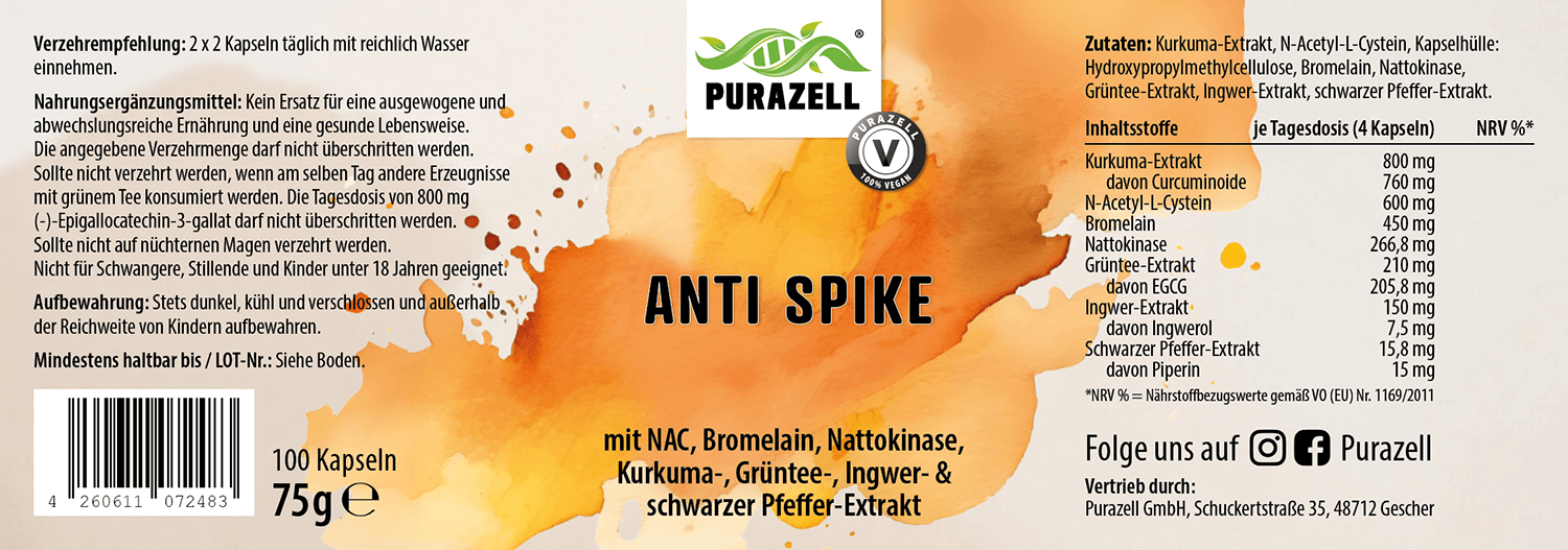 - Hochwirksame Inhaltsstoffe: Unser Anti-Spike enthält Premium Pflanzenextrakte und Enzyme in idealer Dosierung und besonders gut nutzbarer Form. Wir setzen unter anderem auf Nattokinase, NAC, Bromelain, Grüntee-, Ingwer-, Kurkuma- und Schwarzer-Pfeffer-Extrakt.