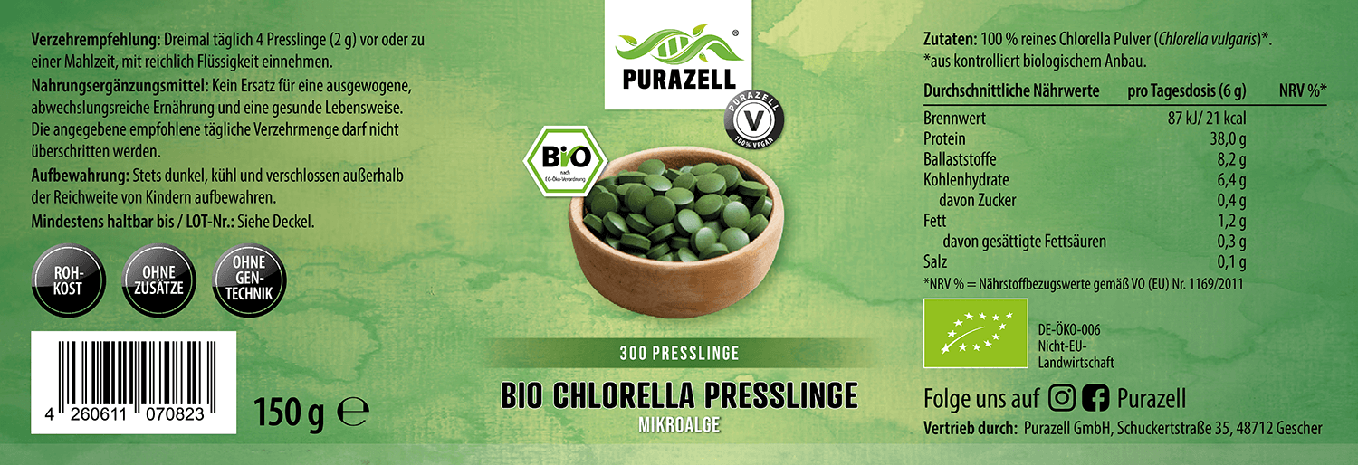 Unsere Chlorella-Presslinge bestehen zu 100 % aus der Süßwasser-Mikroalge Chlorella vulgaris und werden schonend aus kontrolliert kultivierten Algen hergestellt. Die Mikroalgen gedeihen in speziell überwachten Aquakulturen, wo sie unter optimalen Licht-, Temperatur- und Nährstoffbedingungen wachsen. Nach der Ernte werden die Algen schonend getrocknet, fein vermahlen und anschließend ohne Zusätze zu handlichen Presslingen verarbeitet – so bleibt die natürliche Qualität des Rohstoffs bestmöglich erhalten.