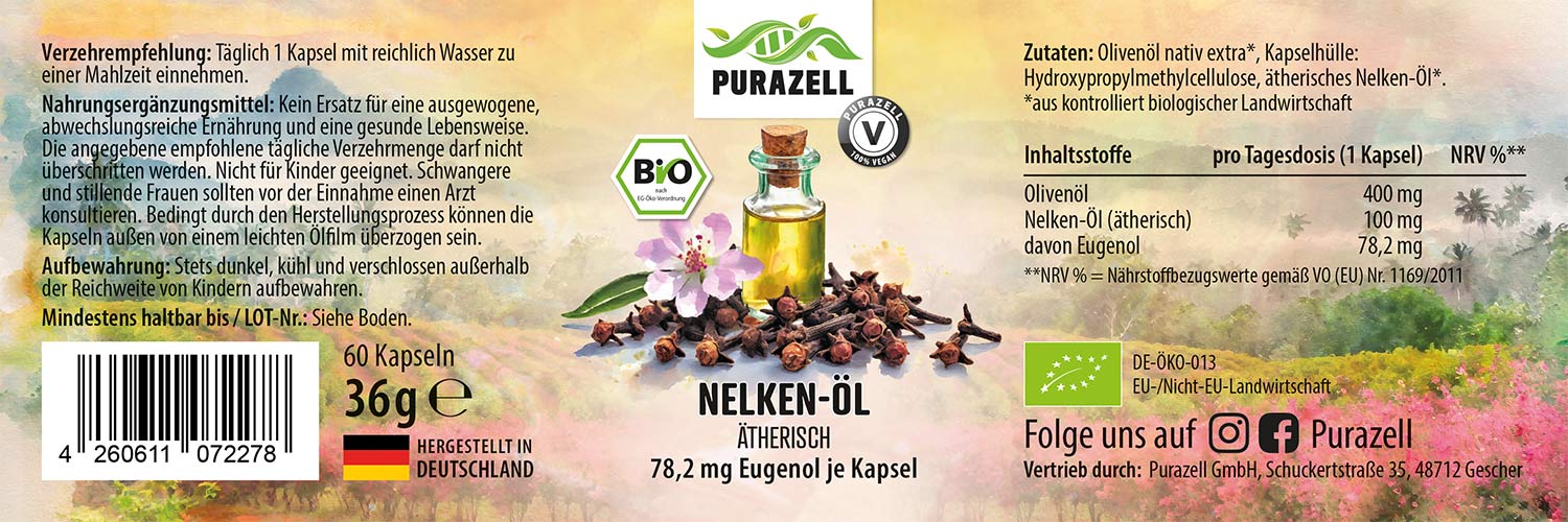 - Frei von Zusatzstoffen: Purazell Bio Nelken-Öl Kapseln sind 100 % vegan und frei von Gluten, Laktose, Farbstoffen, Konservierungsstoffen und Gentechnik.