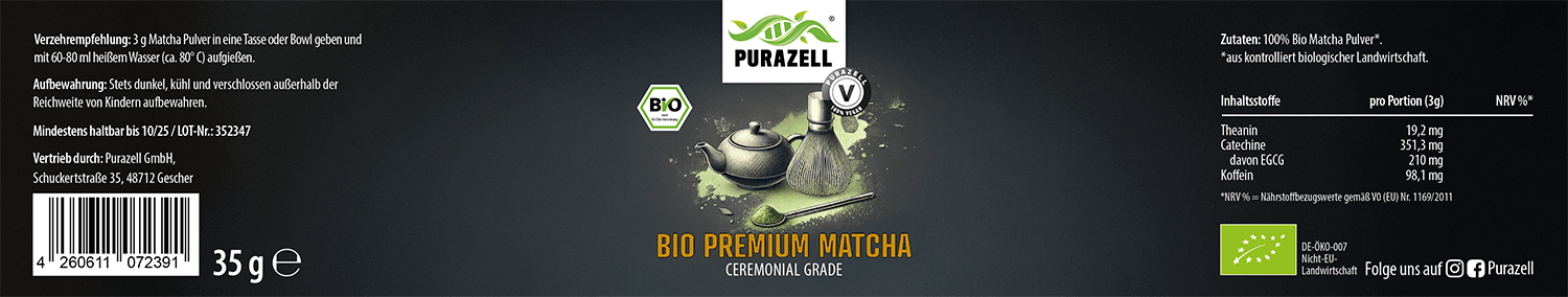 - Frei von Zusatzstoffen: Purazell Matcha ist ein 100-prozentiges Bio-Produkt, vegan und frei von Gluten, Laktose, Farbstoffen, Konservierungsstoffen und Gentechnik.