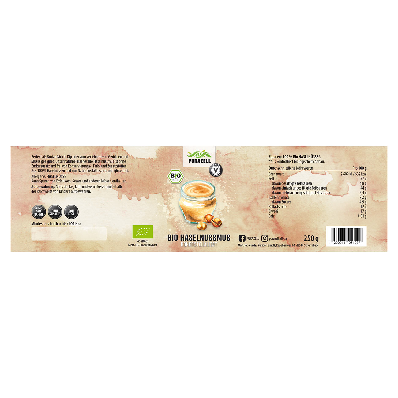 Perfekt als Brotaufstrich, Dip oder zum Verfeinern von Gerichten und Müslis geeignet. Unser naturbelassenes Bio Haselnussmus ist frei von Zucker, Konservierungs-, Farb- und Zusatzstoffen. Aus 100 % Haselnüssen und von Natur aus glutenfrei. Optimal für eine vegane und vegetarische Ernährungsweise.