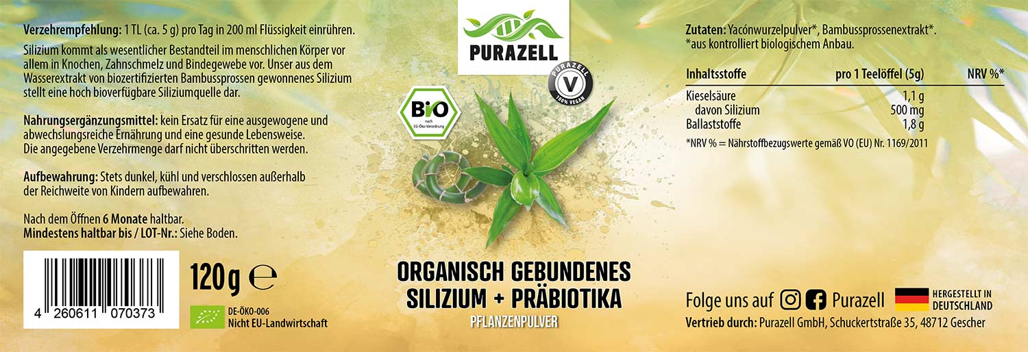 Unser aus dem Wasserextrakt von biozertifizierten Bambussprossen gewonnenes Silizium stellt eine hoch bioverfügbare Siliziumquelle dar. Die natürlichen Präbiotika aus der Yaconwurzel sorgen für eine optimale Aufnahme der wertvollen Nährstoffe.