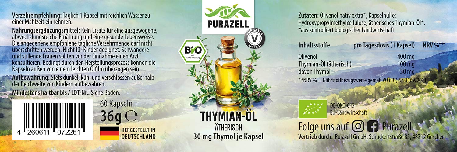 - Frei von Zusatzstoffen: Purazell Bio Thymian-Öl Kapseln sind 100 % vegan und frei von Gluten, Laktose, Farbstoffen, Konservierungsstoffen und Gentechnik.