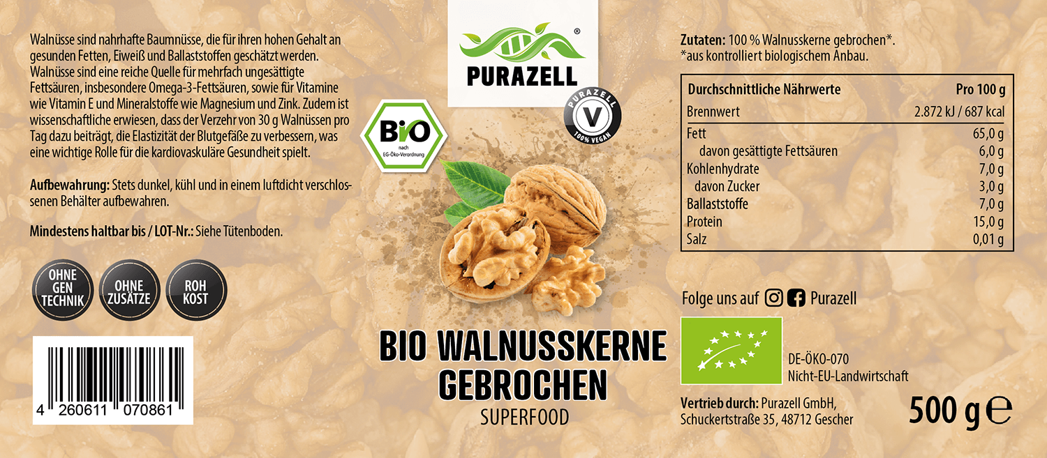 Unsere Walnusskerne stammen aus kontrolliert ökologischem Anbau und stellen eine natürliche Quelle für einfach und mehrfach ungesättigten Fettsäuren dar. Sie liefern Vitamin E und sind reich an B-Vitaminen. Egal, ob im Müsli oder als gesunder Snack für zwischendurch – edel im Geschmack, naturbelassen und erstklassige Rohkostqualität von Purazell.