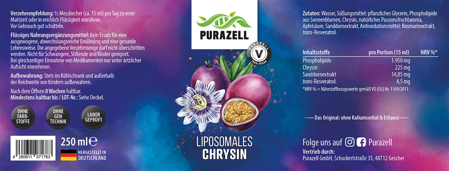 - Eine Portion (15 ml) enthält: 225 mg Chrysin
