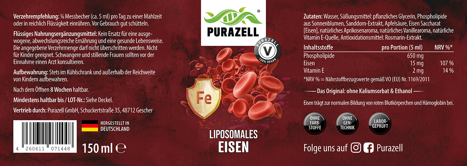 Wir empfehlen die Einnahme von unserem liposomalen Eisen nach einer Mahlzeit. Idealerweise mit Wasser, Saft oder anderen Flüssigkeiten. Sehr kalte oder heiße Getränken sollten jedoch vermieden werden, da sie die Stabilität der Liposomen negativ beeinflussen können. Nach dem Anbruch sollten unsere liposomalen Produkte kühl aufbewahrt werden. Einfrieren ist nicht zu empfehlen. Purazell Supplemente können problemlos mit anderen Produkten kombiniert werden.