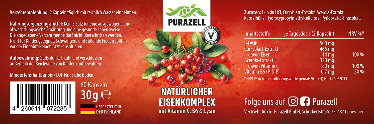 Unsere einzigartige Mischung aus hochwertigen Inhaltsstoffen enthält neben der natürlichen Eisenquelle Curryblatt-Extrakt zudem Vitamin C aus Acerola-Extrakt, L-Lysin und Vitamin B6 in seiner besten Form (Pyridoxal-5-Phosphat)!
