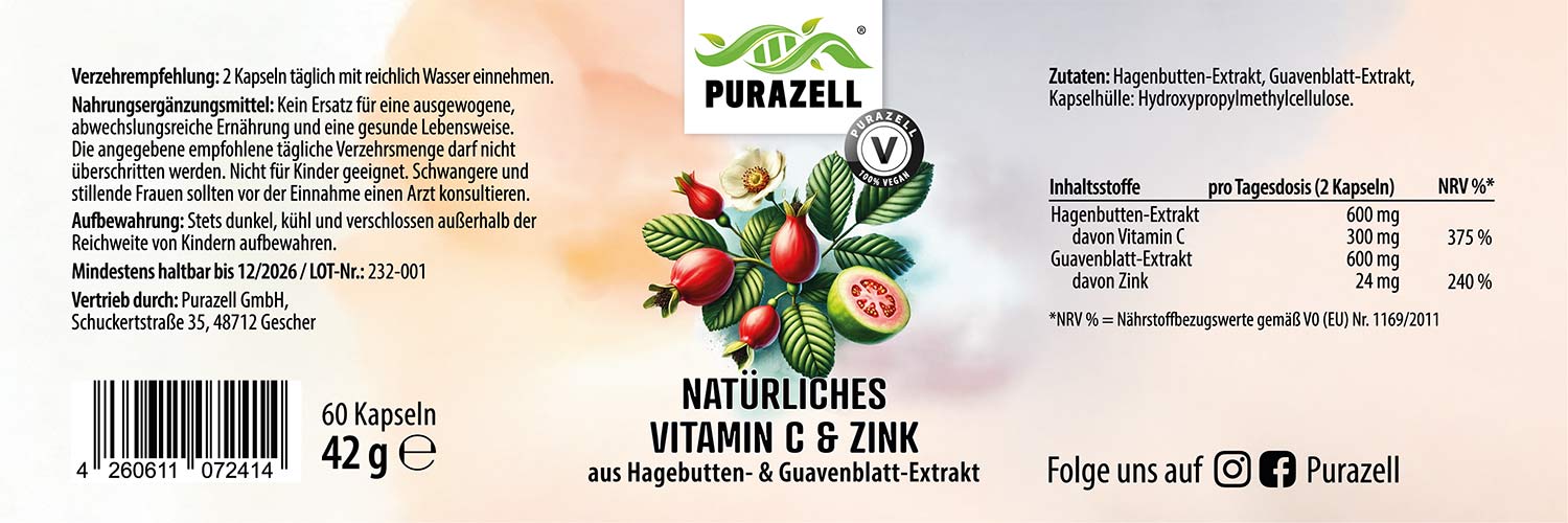 Deine Gesundheit verdient nur das Beste aus der Natur! Unser natürliches Vitamin C & Zink versorgt deinen Körper mit hochwertigem Zink aus Guavenblatt-Extrakt und natürlichem Vitamin C aus Hagebutten-Extrakt – eine einzigartige Kombination für dein Immunsystem (1) und dein Wohlbefinden. Mit 24 mg Zink (240 % NRV) und 300 mg Vitamin C (375 % NRV) pro Portion deckt unser natürliches Vitamin C & Zink-Komplex deinen täglichen Bedarf mehr als ausreichend – und das ausschließlich aus natürlichen Quellen!