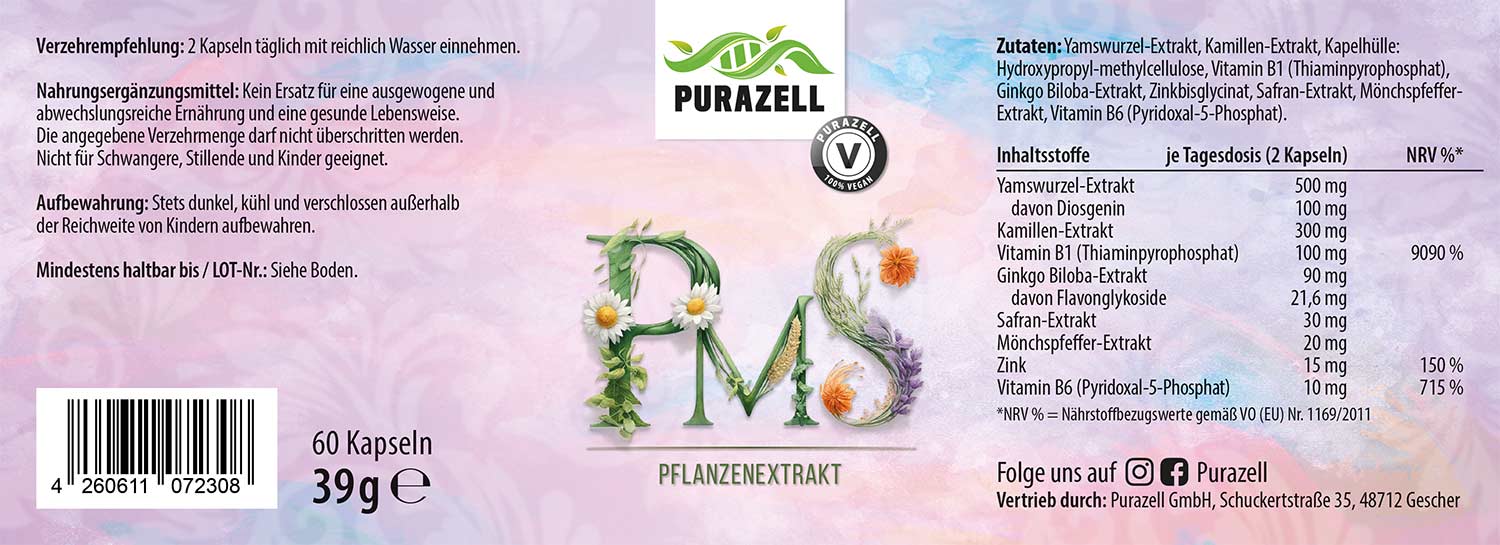 Die einzigartige Kombination aus Wilde Yamswurzel-Extrakt, Mönchspfeffer-Extrakt, Kamillen-Extrakt, Gingko-Blatt-Extrakt und Safran-Extrakt ergänzt sich ideal mit den essenziellen Nährstoffen Vitamin B6, Vitamin B1 und Zink. Wie immer haben wir darauf geachtet, dass du bei uns nur die Vitamine und Mineralstoffe erhältst, die dein Körper optimal aufnehmen und für die relevanten Stoffwechselwege nutzen kann.