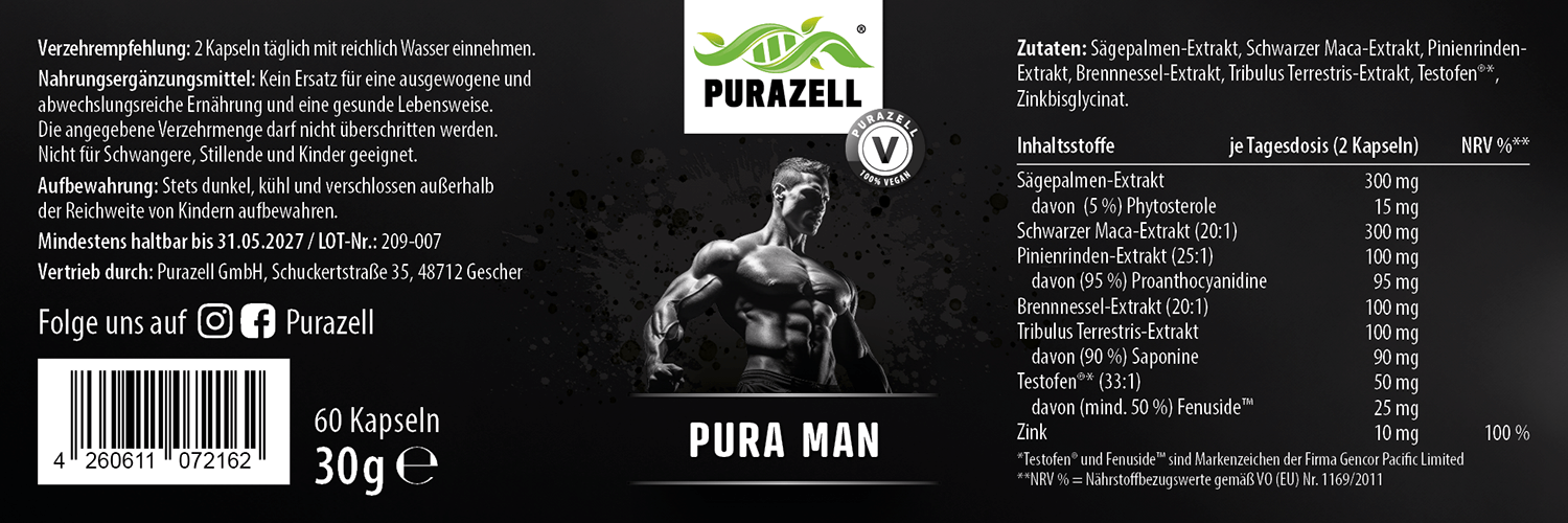 Pura Man kann dich mit seiner optimalen Kombination aus den sorgfältig ausgewählten, extra stark konzentrierten Inhaltsstoffen Sägepalmen-Extrakt, schwarzer Maca-Extrakt, Pinienrinden-Extrakt, Brennnesselwurzel-Extrakt, Tribulus Terrestris-Extrakt, Testofen und Zink beim Prozess der eigenen Weiterentwicklung unterstützen. Der essenzielle Mineralstoff Zink trägt durch seine vielfältigen biochemischen Funktionen unter anderem zu einer normalen Fruchtbarkeit und Reproduktion sowie zum Erhalt eines normalen Testosteronspiegels bei. Auch eine normale kognitive Funktion und die normale Eiweißsynthese wird durch Zink aufrechterhalten. Die Rezeptur unseres Männerprodukts wurde auf Basis der aktuellen Studienlage konzipiert und die Inhaltsstoffe so ausgewählt, dass sie ihre maximale Wirksamkeit entfalten können.