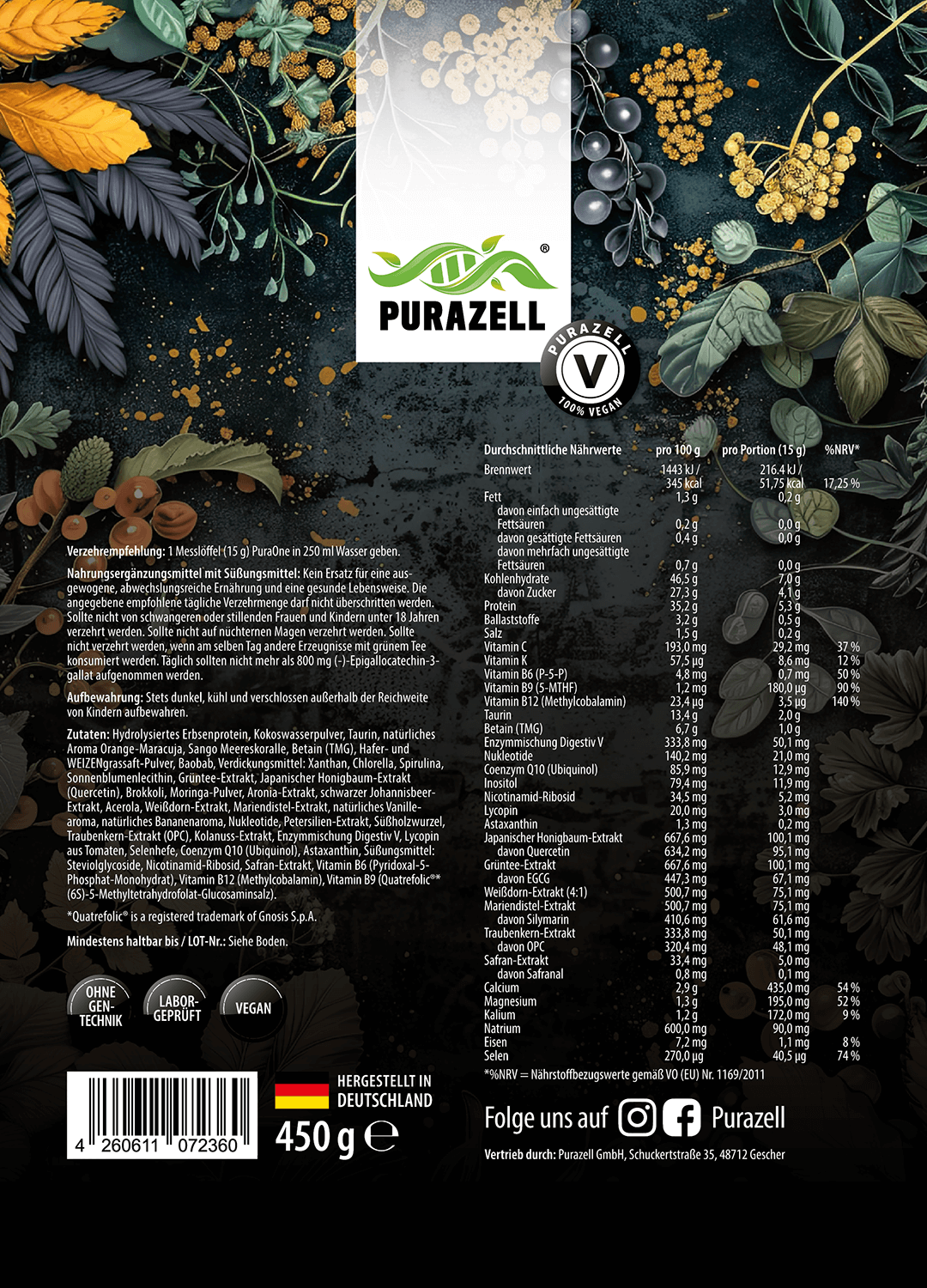 - Für alle Ernährungsformen: Pura One ist ein 100 % veganes Nahrungsergänzungsmittel, das ohne Gentechnik auskommt und kein Gluten enthält.