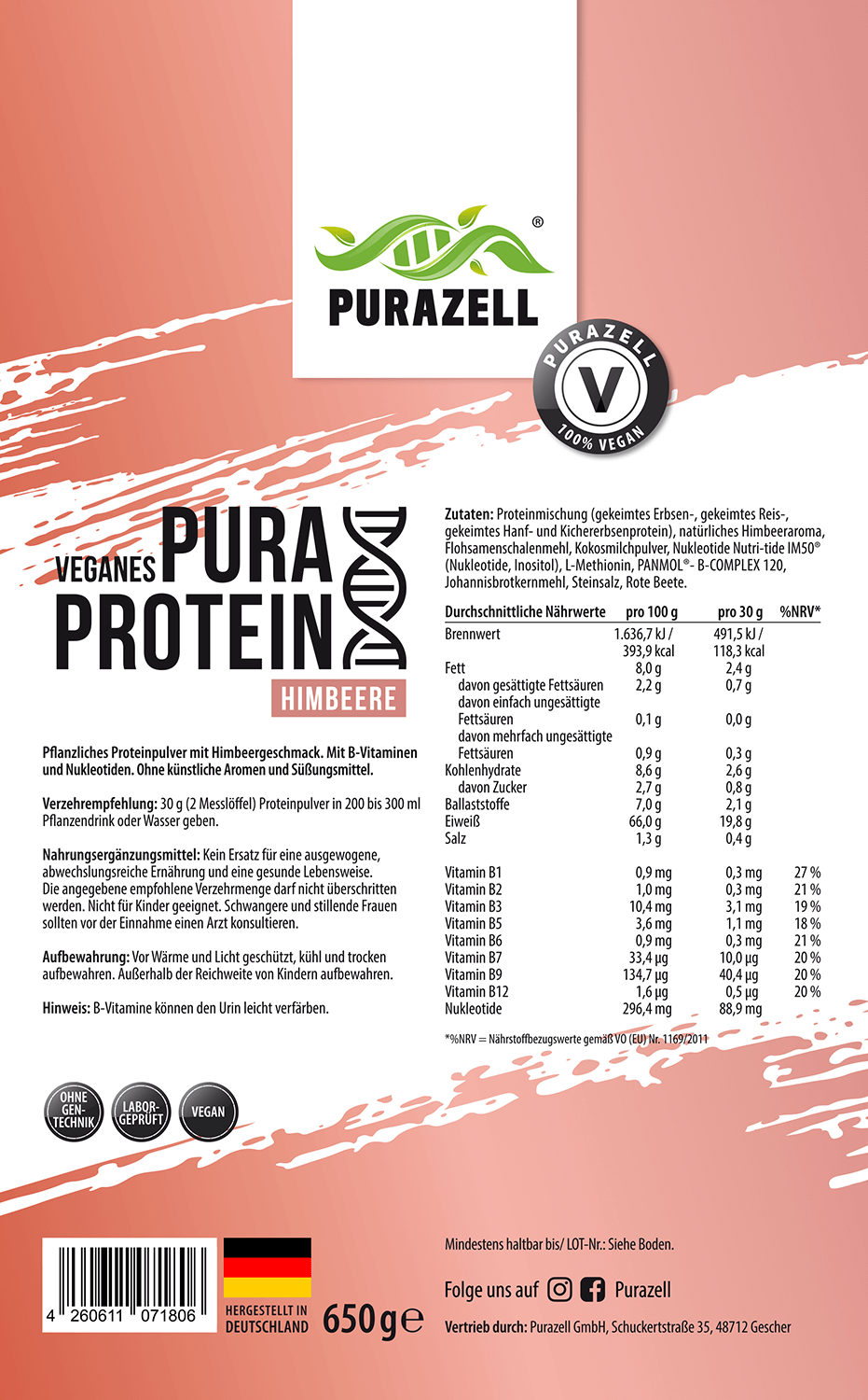 Gesunde Vitamin-Level sind essentiell für ein normales Wachstum und die Entwicklung aller Körperorgane und-gewebe. Und auch Muskeln bestehen aus Muskelgewebe. Gutes Training ist wichtig, klar, doch nur die wenigsten beachten dabei folgendes: Biotin unterstützt die Energiegewinnung aus Fett und wird benötigt, um die Energiegewinnung aus Kohlenhydraten zu steuern - und ist sogar am Zellwachstum beteiligt. Auch Vitamin B9 ist am Zellwachstum und an der Blutbildung beteiligt. Zusammen mit B12 unterstützt es den Erhalt der Knochendichte und die Leistungsfähigkeit des Gehirns. Vitamin B12 ist außerdem an der DNA-Synthese und damit an allen Wachstumsvorgängen im Körper beteiligt. Pyridoxin (Vitamin B6) ist wichtig für die Muskelaktivität, denn es wird für die Gewinnung von Energie aus den Kohlenhydratspeichern in den Muskeln benötigt. Niacin (Vitamin B3) ist nicht nur wichtig für den Stoffwechsel, es unterstützt auch den Blutfluss der Gefäße. Riboflavin (Vitamin B2) unterstützt die Verwertung von Nährstoffen. Zudem dient es als Oxidationsschutz - und beim Training, aber auch im aktiven Alltag, benötigen wir diesen ganz besonders. Thiamin (Vitamin B1) spielt eine ganz besondere Rolle für die stoffwechselaktive Ernährung und die Optimierung der Zellfunktion. Ein Mangel an Thiamin ist mit der Erkrankung “Beri Beri” assoziiert, was so viel wie “Schwach Schwach” bedeutet. Einer von vielen Gründen, warum wir unsere Thiamin-Level immer gesund halten wollen, “Stark Stark” finden wir nämlich deutlich besser. … deshalb ist unser hochwertiges, rein pflanzliches Pura Protein mit Nukleotiden und einer guten Portion B-Vitaminen ausgestattet. Alles, was Du tun musst, ist, Dich zu entscheiden: Neutral, Vanille oder doch lieber Himbeere?