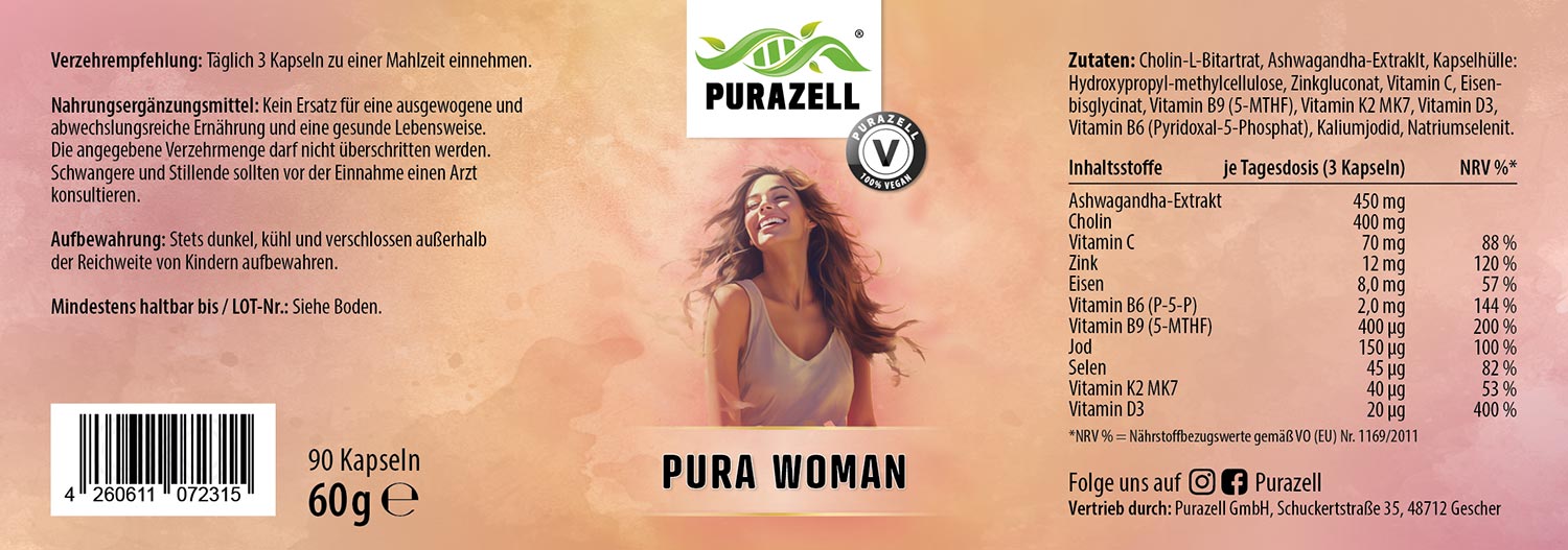 Pura Women – Das ganzheitliche Nahrungsergänzungsmittel für die Gesundheit von Frauen. Pura Women wurde speziell entwickelt, um die allgemeine Gesundheit von Frauen zu unterstützen. Unsere optimal auf die Bedürfnisse des weiblichen Körpers abgestimmte Formel enthält eine Kombination aus essenziellen Vitaminen und Mineralien in ihrer am besten bioverfügbaren Form sowie den kraftvollen Pflanzenextrakt Ashwagandha.