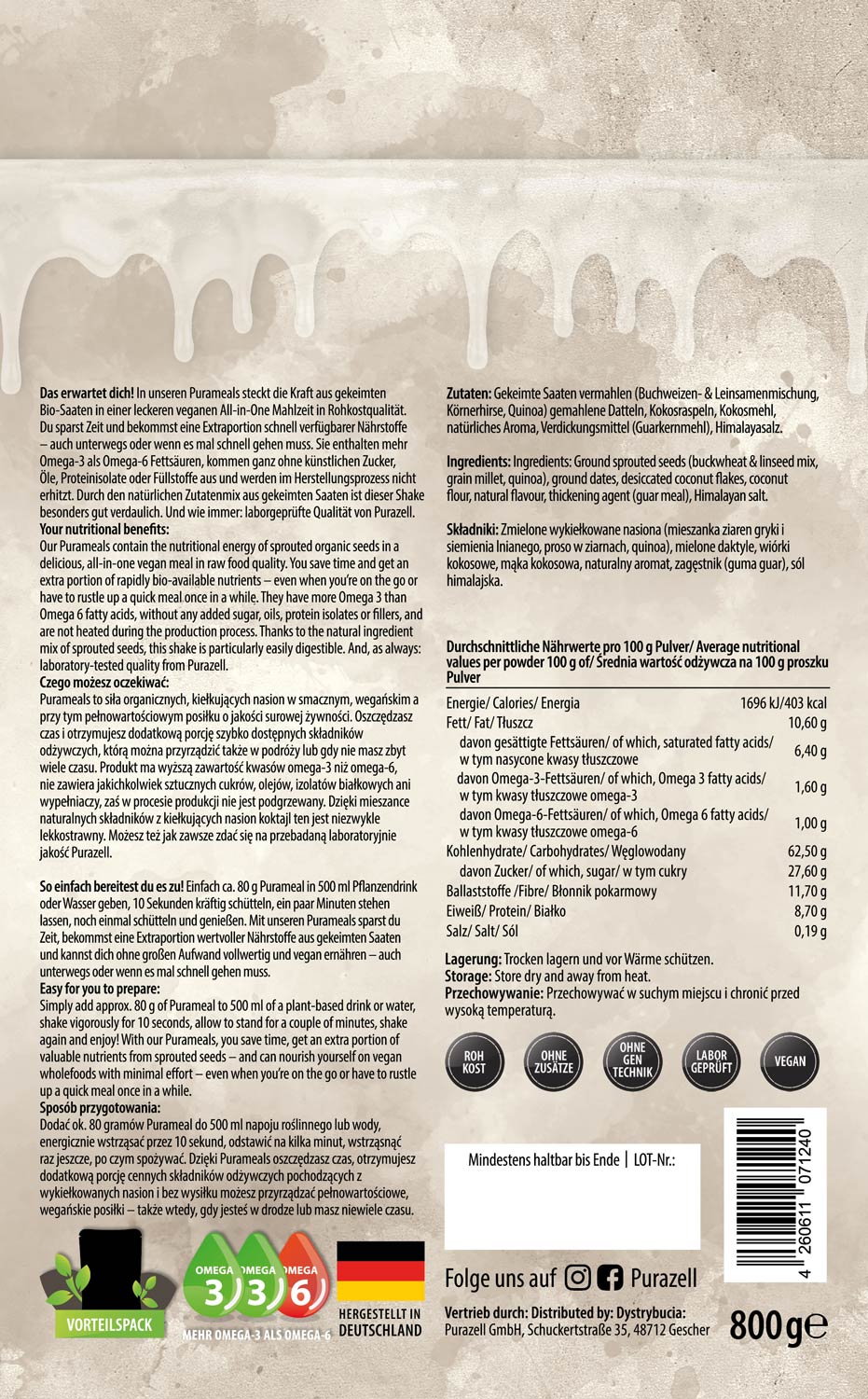 C.a. 80 g Purameal in 500 ml Pflanzendrink oder Wasser geben, 10 Sekunden kräftig schütteln, ein paar Minuten stehenlassen, noch einmal schütteln und genießen.