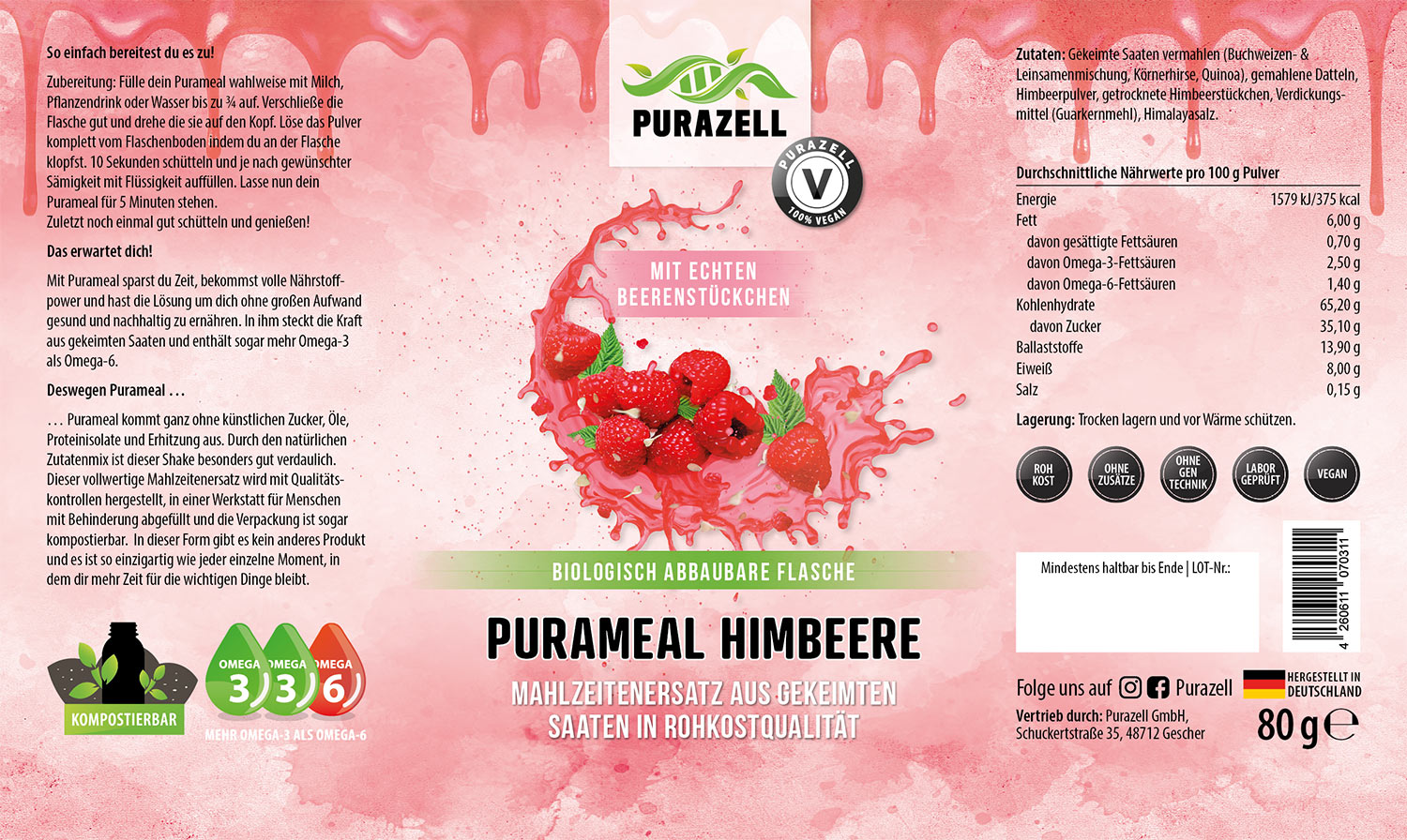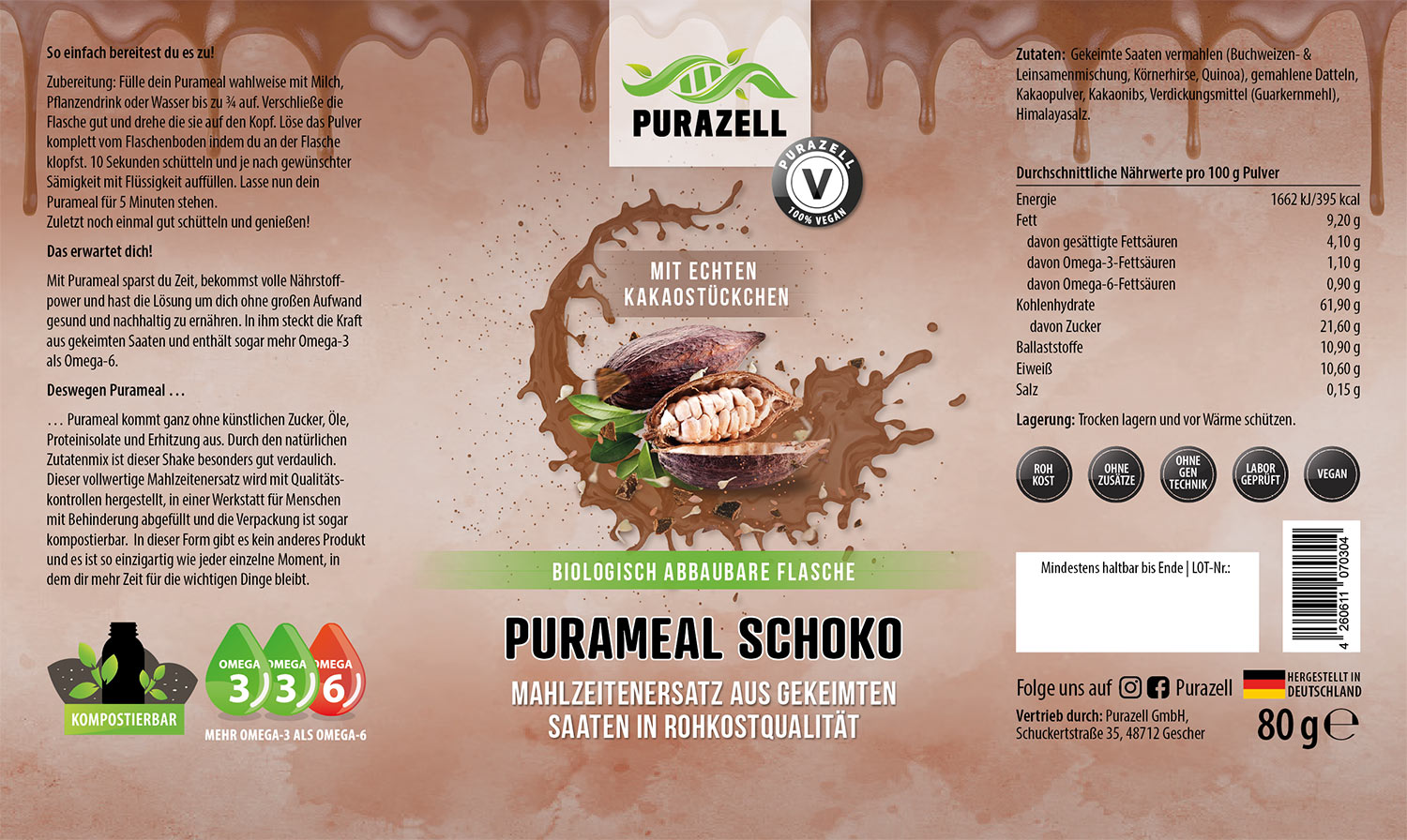 Unsere Purameals auf Basis von gekeimten Saaten sind perfekt dafür geeignet, deinen Körper mit erstklassigen Nährstoffen und Mineralien zu versorgen. Eine leckere all-in-one-Mahlzeit, die blitzschnell und überall durch Zugabe von Wasser oder Pflanzenmilch zubereitet werden kann.