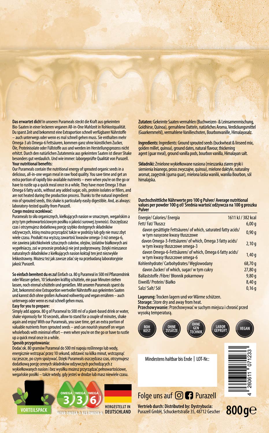 Unsere Purameals auf Basis von gekeimten Saaten sind perfekt dafür geeignet, deinen Körper mit erstklassigen Nährstoffen und Mineralien zu versorgen. Eine leckere all-in-one-Mahlzeit, die blitzschnell und überall durch Zugabe von Wasser oder Pflanzenmilch zubereitet werden kann.