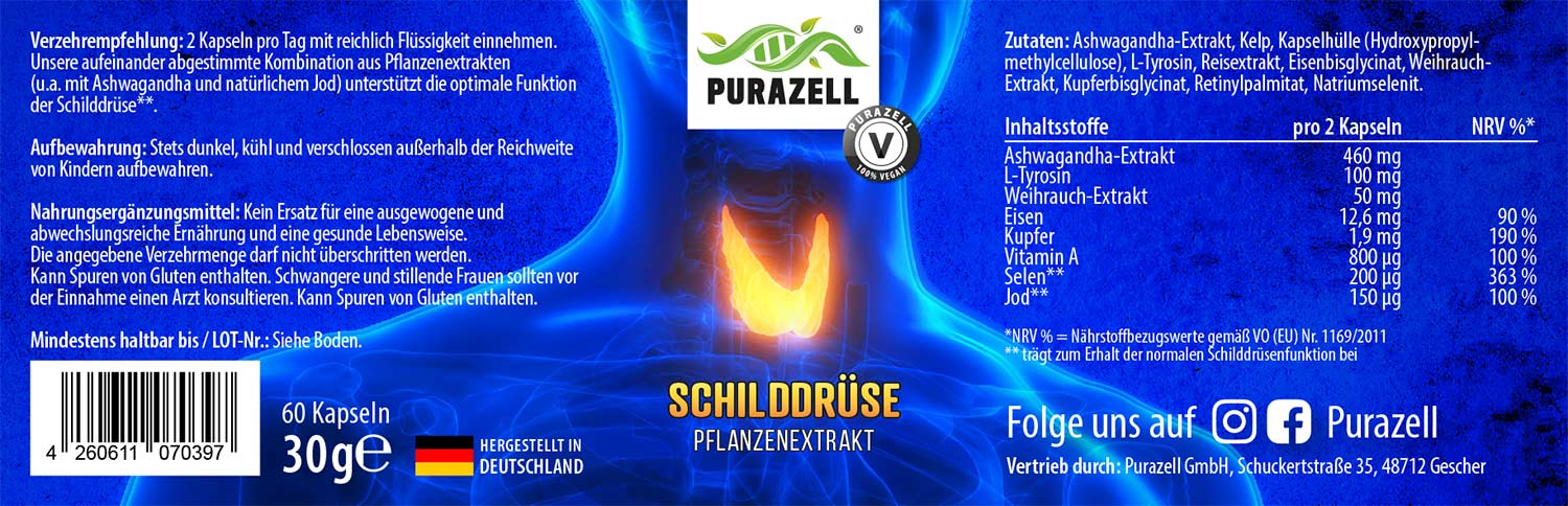 - Frei von Zusatzstoffen: Purazell Schilddrüse ist 100 % vegan und frei von Gluten, Laktose, Farbstoffen, Konservierungsstoffen und Gentechnik.