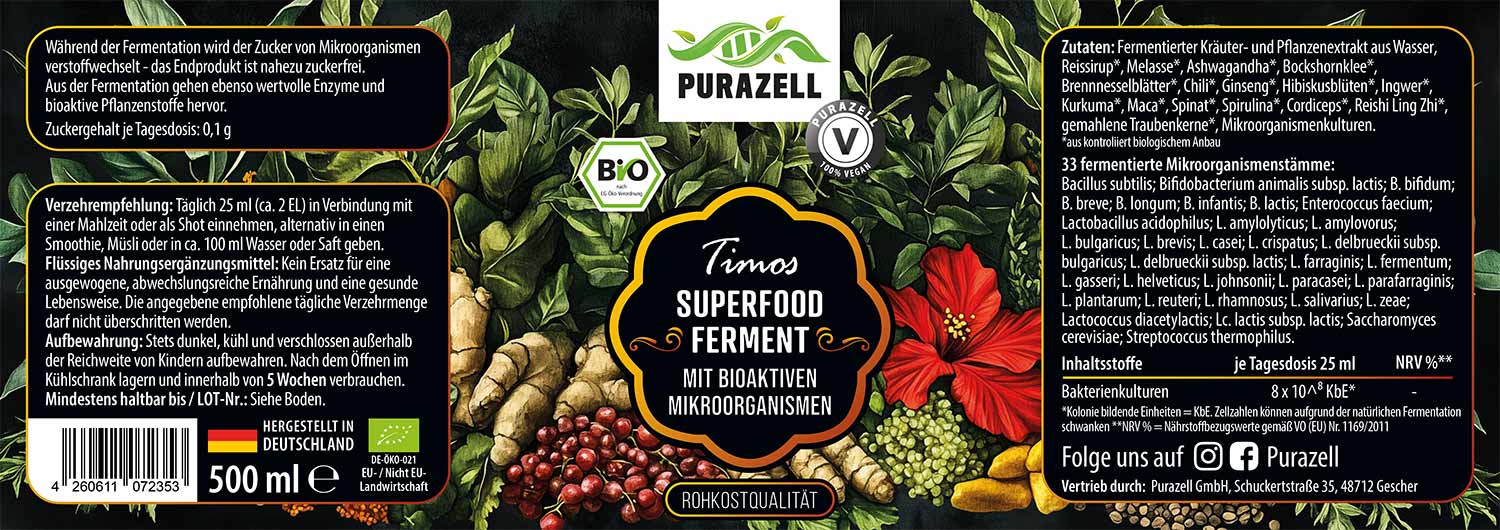 Unser in Zusammenarbeit mit Timo G. entwickeltes Superfood-Ferment kombiniert 33 sorgfältig ausgewählte Mikroorganismenstämme mit frischen, biologisch angebauten Superfoods wie Ashwagandha, Kurkuma, Maca, Ingwer, Ginseng, Chili, Brennnesselblätter, Bockshornklee, Spirulina, Cordyceps, Reishi, Spinat und Hibiskusblüten. Durch die mehrstufige Fermentation entsteht ein hochwertiges Produkt in Rohkostqualität – hervorragend geeignet zur puren Einnahme oder zur Ergänzung eines Smoothies. Unser Ferment enthält: