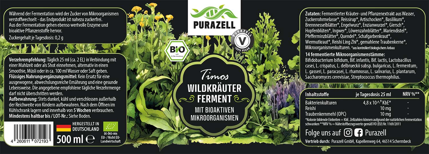 Unsere sorgfältig mit Timo ausgewählten Zutaten umfassen Artischocken, Basilikum, Brennnesselblätter, Engelwurz, Enzianwurzel, Giersch, Hopfenblüten, Ingwer, Löwenzahnblätter, Mariendistel, Pfefferminzblätter, Quendel, Schafgarbenkraut, Wermutkraut und den kostbaren Reishi Ling Zhi-Pilz. Diese hochwertigen Inhaltsstoffe werden mit gemahlenen Traubenkernen und einer speziellen Mischung aus 14 Mikroorganismenstämmen fermentiert, darunter Bifidobacterium bifidum, Lactobacillus casei, Saccharomyces cerevisiae und Streptococcus thermophilus.