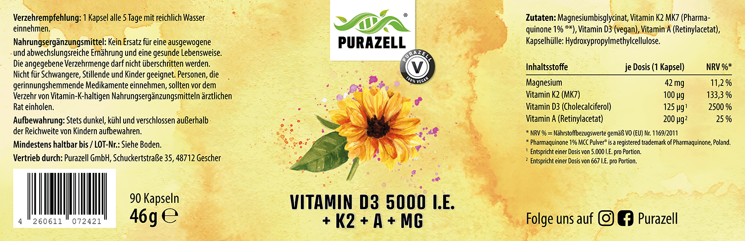 - Frei von Zusatzstoffen: Purazell Vitamin D3 + K2 ist 100 % vegan und völlig frei von Gluten, Laktose, Farbstoffen, Konservierungsstoffen und Gentechnik.