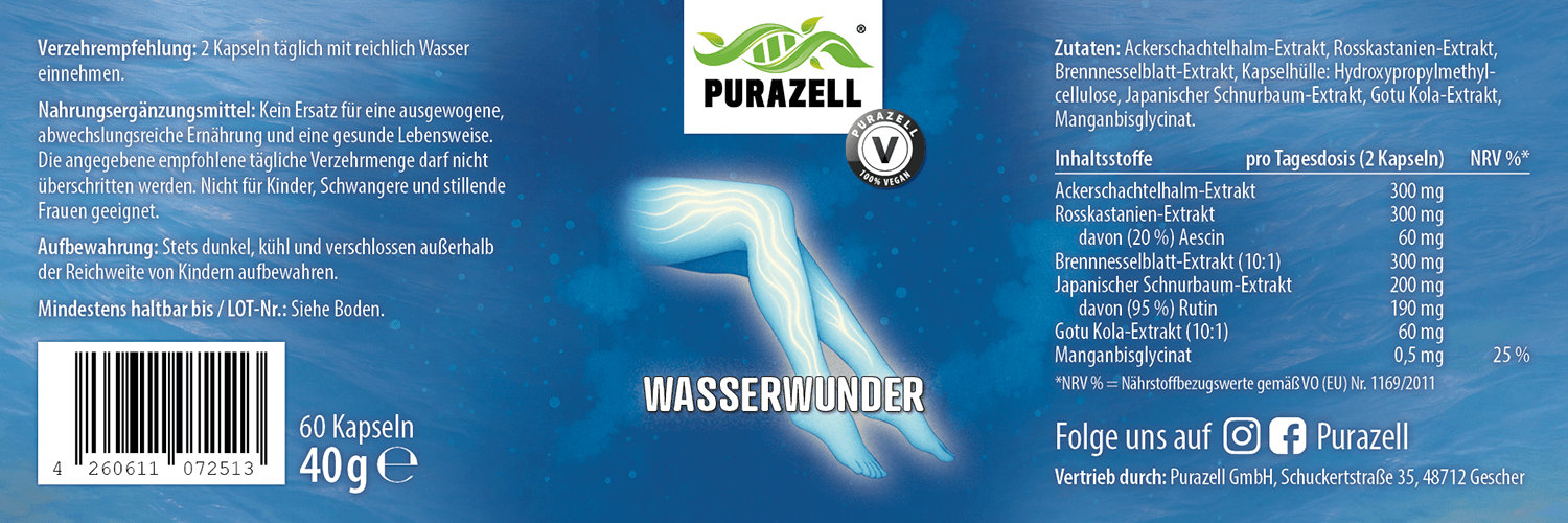 Purazell Wasserwunder setzt auf die Kraft der Natur: Hocheffektive Pflanzenextrakte in Kombination mit dem lebenswichtigen Spurenelement Mangan, das zu einer normalen Bindegewebsbildung beiträgt. Unser Körper benötigt ein gesundes Bindegewebe, um seinen Wasserhaushalt zu regulieren und Wassereinlagerungen zu vermeiden.